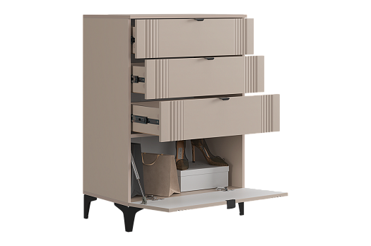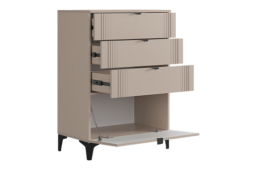 Комод изготовлен из качественных материалов: корпус выполнен из ЛДСП, что гарантирует прочность и долговечность, а фасад, выполненный из МДФ в плёнке ПВХ, не только выглядит эстетично, но и защищает комод от повреждений. Особое внимание заслуживает фрезеровка фасадов, которая придаёт изделию изысканный вид.