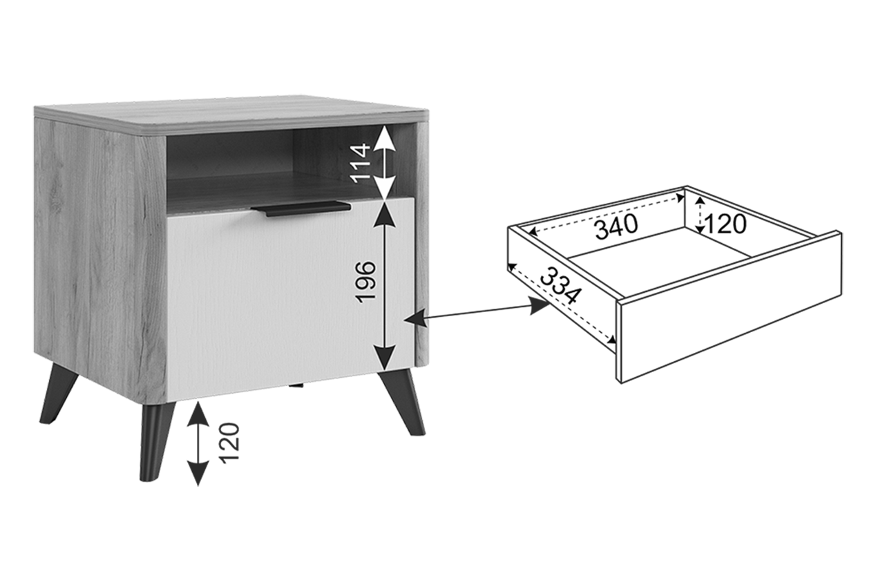 В выдвижном ящике на шариковых направляющих поместятся все необходимые вещи, а на открытой полке телефон, очки, книги и другие приятные мелочи.
