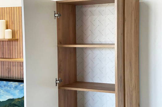 Данный шкаф прекрасно подойдет в гостиную в качестве дополнения к тумбе под ТВ "Моди", а так же, может быть самостоятельным изделием.