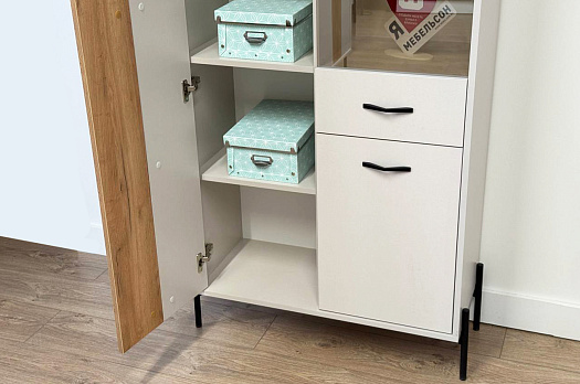 Вторая дверь, выполненная со стеклянной вставкой, позволяет демонстрировать коллекции, декоративные предметы или книги, придавая вашему пространству дополнительный шарм и элегантность.