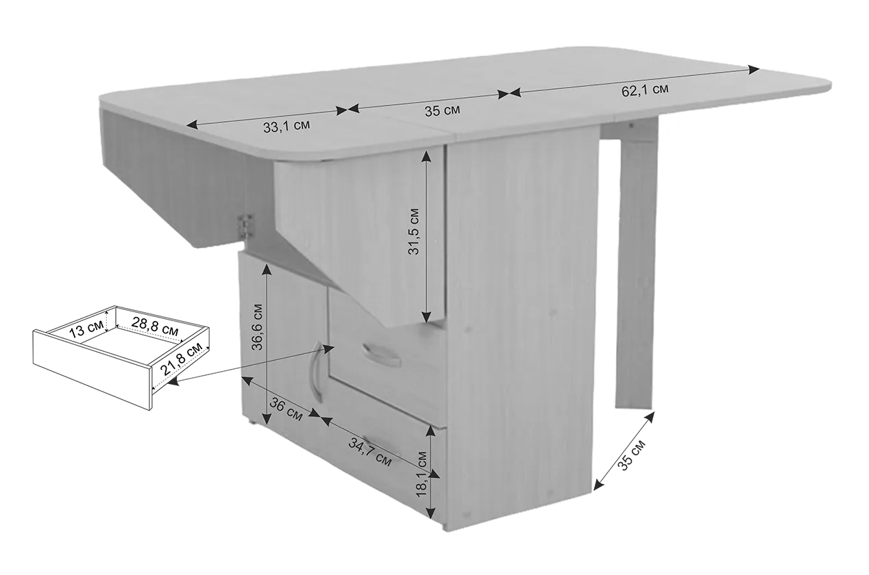 Стол-тумба раскладной: Это изделие сочетает в себе практичность и элегантность. В роли тумбы она предлагает обширные отделения, идеально подходящие для хранения различных предметов - начиная от мелочей и заканчивая обувью. Главная особенность - инновационный механизм, который позволяет превратить верх тумбы в просторный стол. Высший класс для тех, кто ищет гармонию удобства и стиля в интерьере. В полностью раскладном виде, ширина стола достигает 1300 мм.