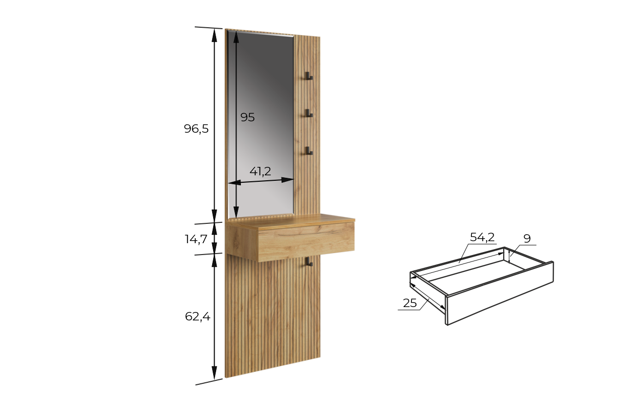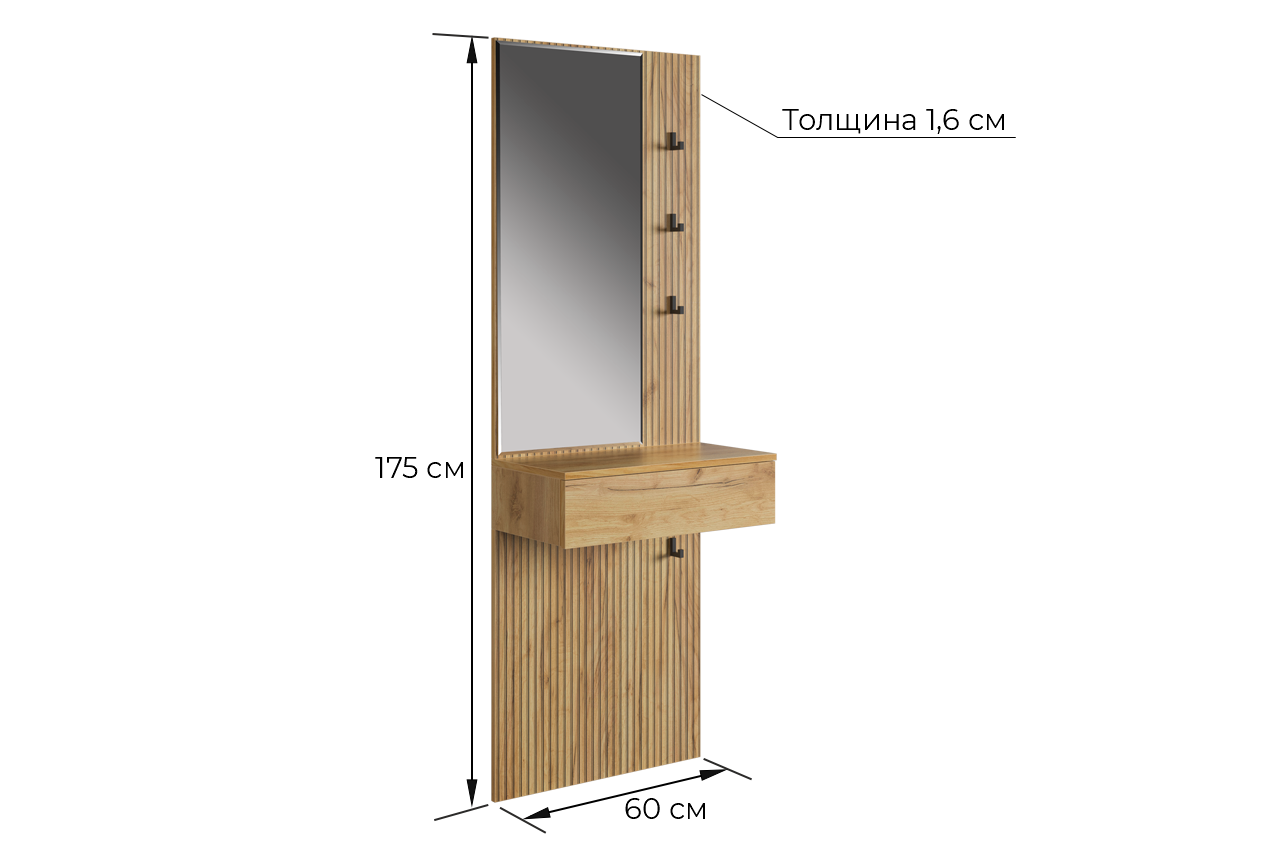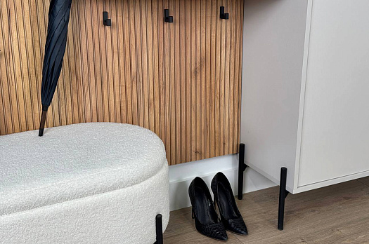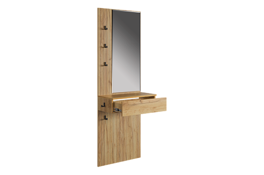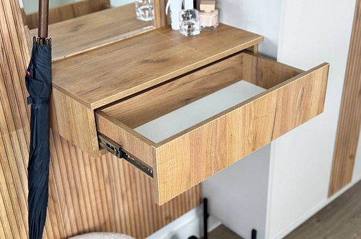 Крючки предоставляют удобное место для хранения сумок или аксессуаров. Выкатной ящик служит дополнительным пространством для хранения мелочей, таких как ключи, кошелек, косметика или другие небольшие предметы.
