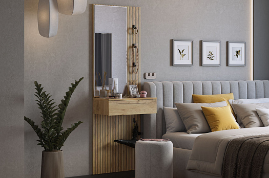 Принт, имитирующий вертикальную фрезеровку, придает зеркалу уникальный и современный вид, добавляя текстуру и глубину. Материал каркаса – ЛДСП, что обеспечивает прочность и долговечность, а также легкость в уходе.