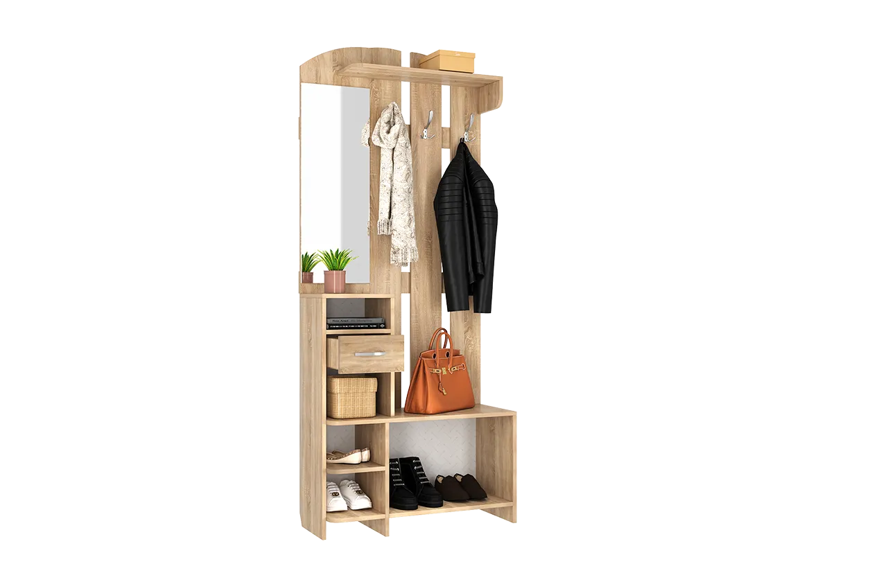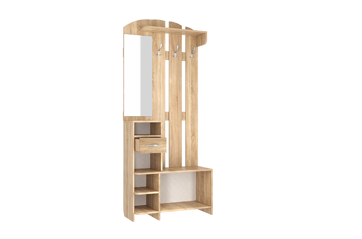 Бюджетное, но функциональное решение для небольшой прихожей. Цвет дуб сонома нейтральный, подходит к любому интерьеру. Конструкция простая, но продуманная - есть штанга для вешалок, полочки для головных уборов и мелочей, отделение для обуви. Материал, конечно, не премиум, но для своей цены вполне достойный. Сборка простая, справится даже новичок. В целом, за такие деньги очень неплохо.