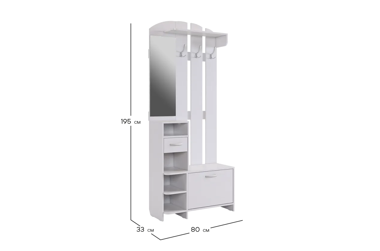 Прихожая Мила: эффективное решение для оптимального использования пространства, сочетающее в себе открытую вешалку с крючками, место для обуви, компактное зеркало и удобный ящик с полочками для всевозможных мелочей.