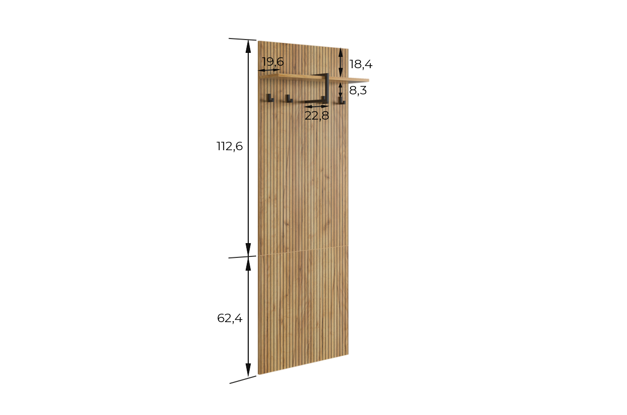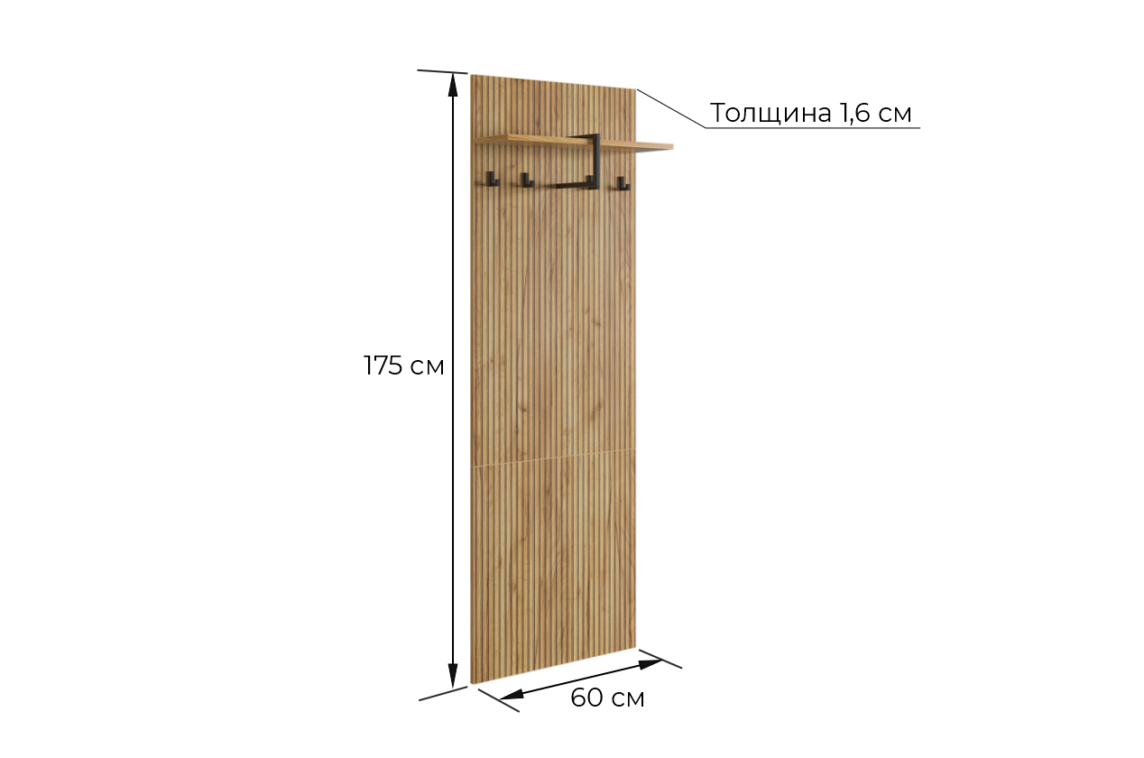 Принт, имитирующий вертикальную фрезеровку придает вешалке уникальный и современный вид, добавляя текстуру и глубину. Материал вешалки – ЛДСП, что обеспечивает прочность и долговечность, а также легкость в уходе.