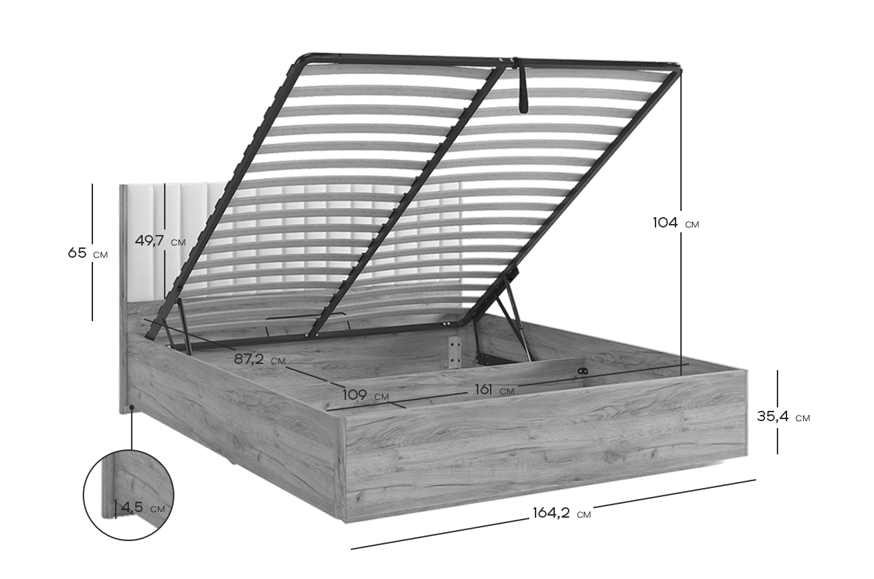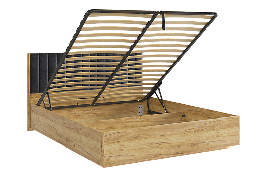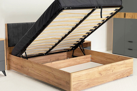 Она не только прекрасно выглядит, но и предлагает дополнительное место для хранения благодаря своему подъемному основанию. Для полноты комфорта учитывайте, что матрас и настил следует приобрести отдельно.