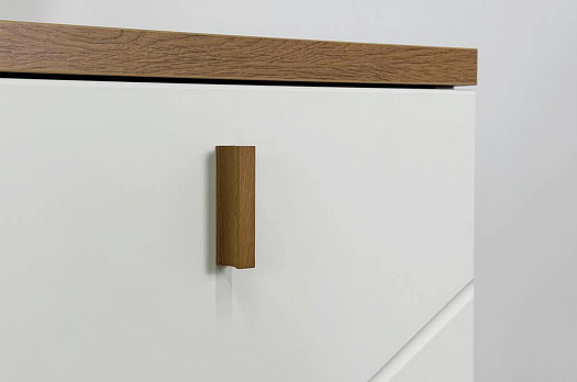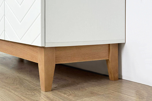 Корпус комода выполнен из ЛДСП в цвете белое дерево, что придаёт ему светлый и уютный вид, характерный для скандинавского дизайна. Фасады – из МДФ с фрезеровкой, покрытые матовой белой плёнкой, что подчёркивает натуральность текстуры и создаёт ощущение лаконичности.