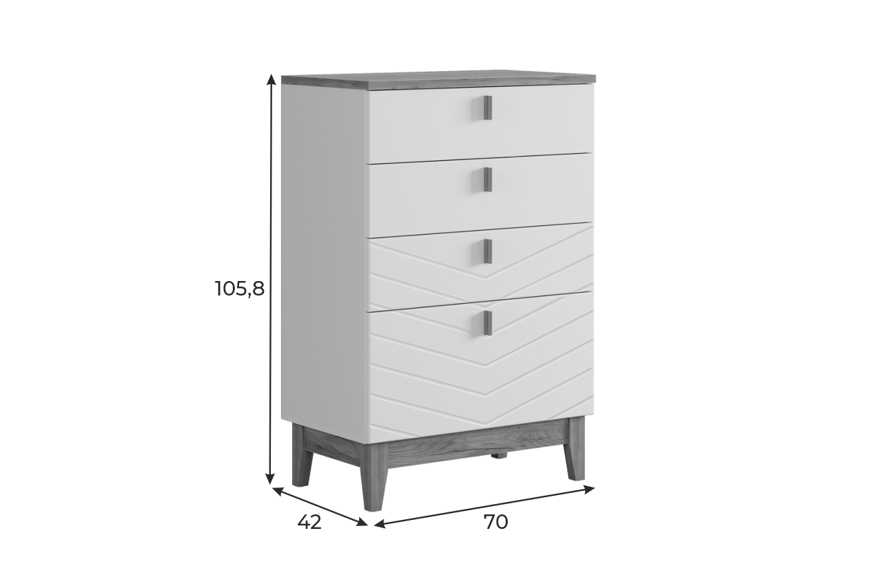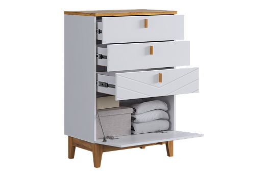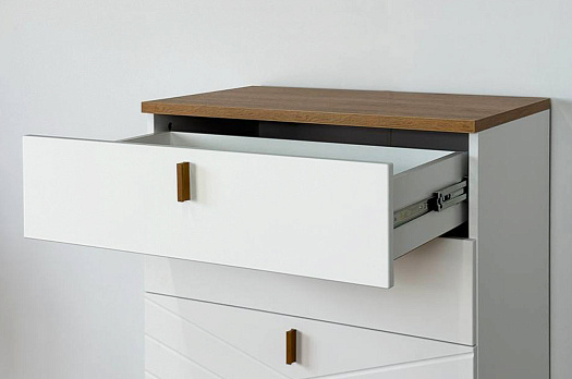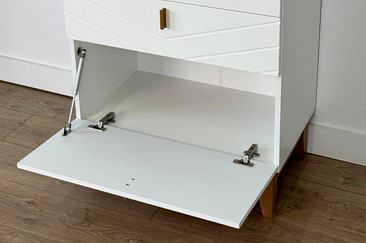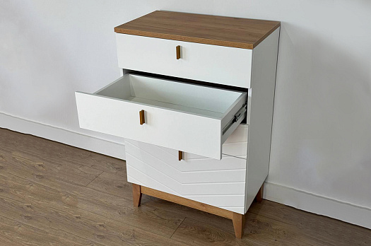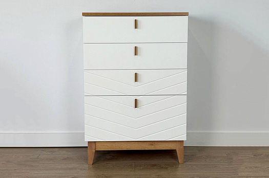 Корпус комода выполнен из ЛДСП в цвете белое дерево, что придаёт ему светлый и воздушный вид. Фасады – из МДФ с фрезеровкой, покрытые матовой белой плёнкой ПВХ, что подчёркивает лаконичность и натуральность скандинавского дизайна.