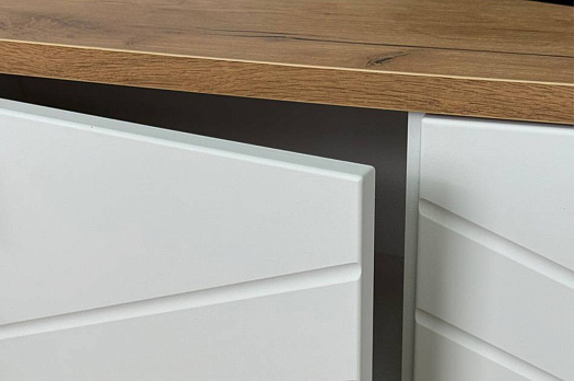 Корпус тумбы выполнен из ЛДСП в цвете белое дерево, что придаёт ей светлый и уютный вид. Фасады – из МДФ с фрезеровкой, покрытые матовой белой плёнкой ПВХ, что подчёркивает натуральность текстуры и создаёт ощущение лаконичности.