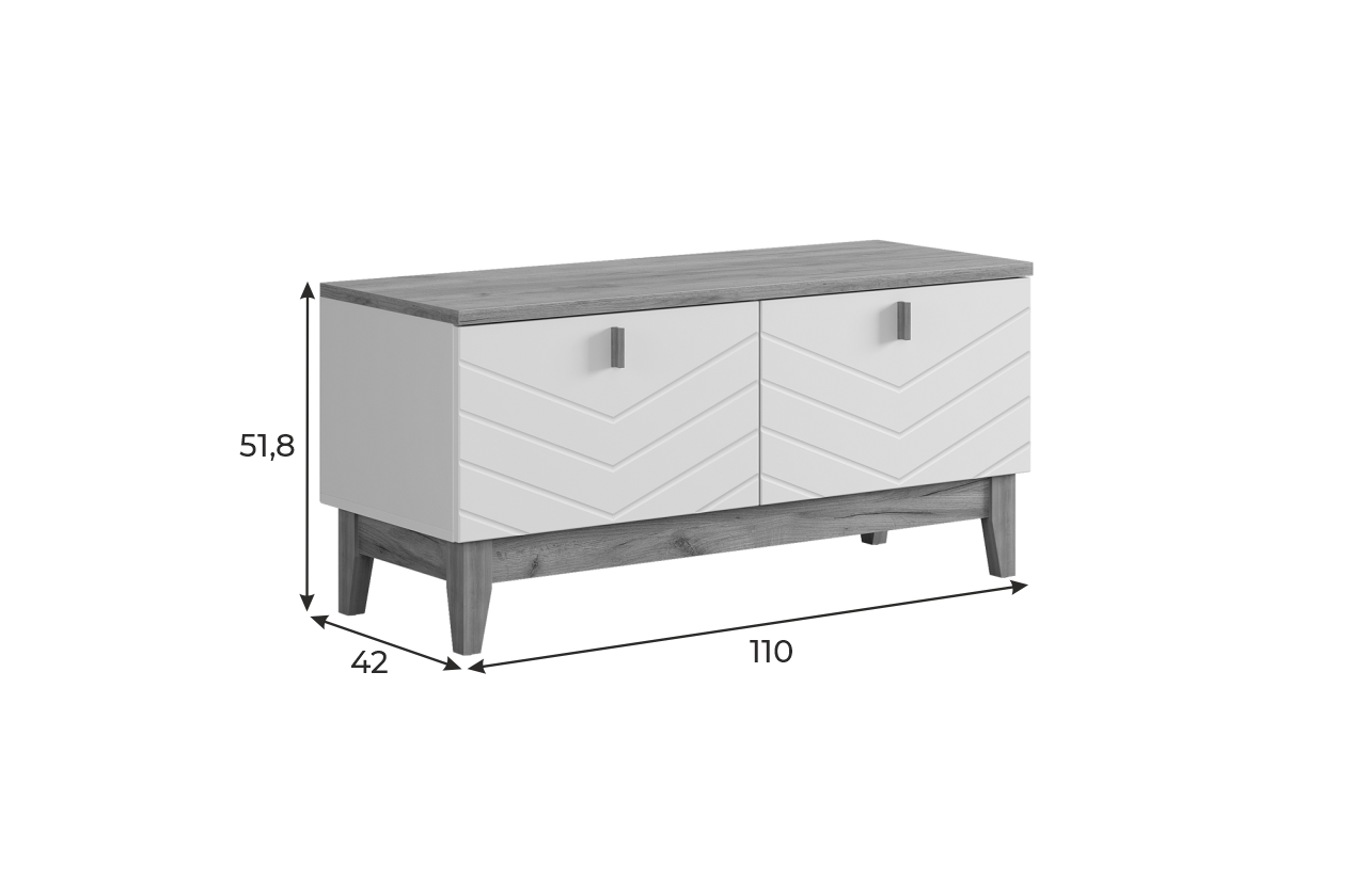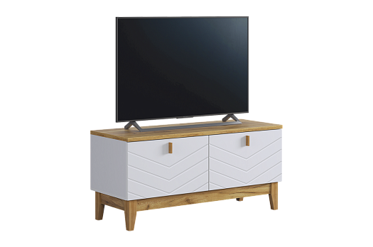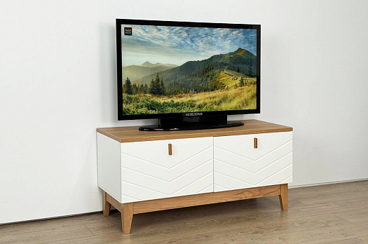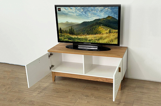 Корпус тумбы выполнен из ЛДСП в цвете белое дерево, что придаёт ей светлый и уютный вид. Фасады – из МДФ с фрезеровкой, покрытые матовой белой плёнкой ПВХ, что подчёркивает натуральность текстуры и создаёт ощущение лаконичности.