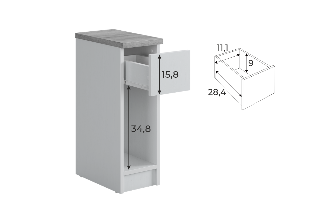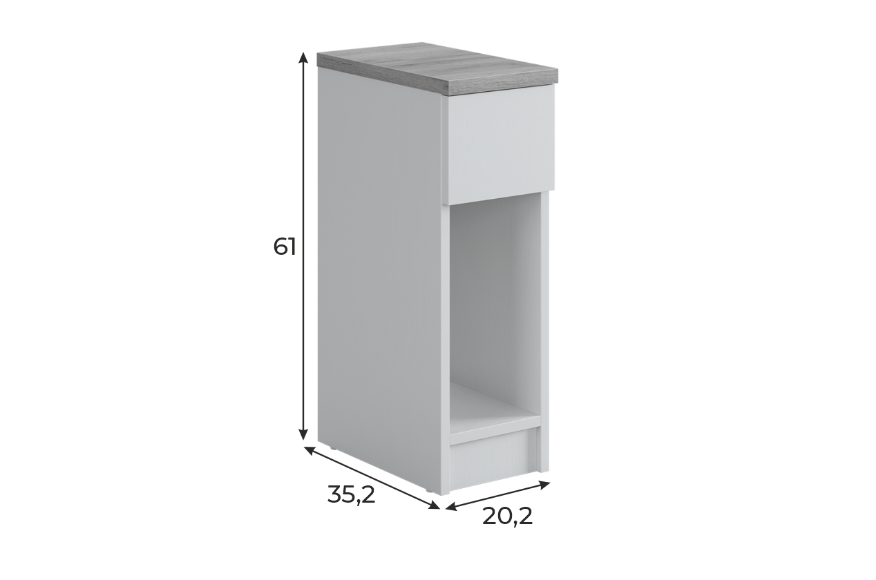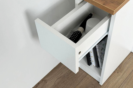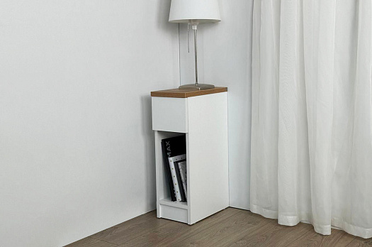 Модель изготовлена из качественного ЛДСП: основная часть — из плиты толщиной 16 мм, крышка — 22 мм. Выкатной ящик с роликовыми направляющими обеспечивает плавное и надёжное движение, а открытая ниша позволяет удобно разместить небольшие предметы.
