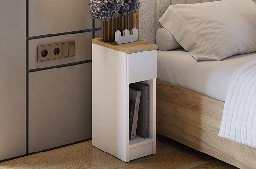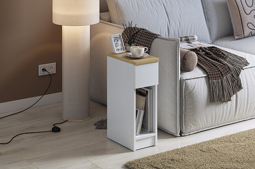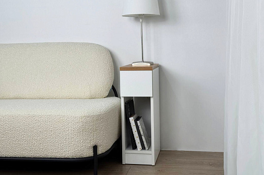 Тумба установлена на подпятниковые опоры, что придаёт ей устойчивость. Благодаря универсальному дизайну модель можно использовать как прикроватную тумбу или журнальный столик.